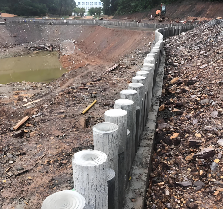 河道邊的土大多是淤泥、軟土,有的還夾雜石頭、樹(shù)根。施工前一定要用洛陽(yáng)鏟或探測(cè)儀查土質(zhì),比如淤泥層有多厚、下面有沒(méi)有硬土層。要是淤泥太厚,直接打樁容易 “打空”,樁會(huì)往下陷,這時(shí)候就得先清淤,或者用碎石墊一層 “打底”;要是有石頭、樹(shù)根,不清理掉會(huì)把樁頂裂,還會(huì)讓樁打不直。水泥仿木樁施工隊(duì)泓樺錦嘉去年在蘇州某河道施工,清出了不少樹(shù)根,要是沒(méi)清,至少一半的樁得廢。3. 算好樁的規(guī)格:別用 “小身板” 扛大壓力